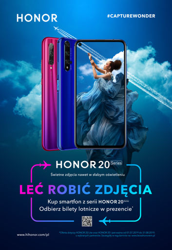Dla polskich użytkowników marka przygotowała też nietypową promocję pod hasłem Leć robić zdjęcia! To specjalna promocja lotnicza skierowaną do osób, które kupią smartfona HONOR 20 lub HONOR 20 Lite w okresie od 1 lipca do 31 sierpnia. Kupujący otrzymają podwójny (w przypadku zakupu Honor 20) lub pojedynczy (w przypadku zakupu Honor 20 Lite) voucher lotniczy na podróż w dwie strony do jednego z 16 miast w Europie. Wśród możliwych celów lotu znajdują się między innymi Londyn, Paryż, Barcelona, Berlin, Bruksela, Kopenhaga, Dublin, Madryt, Mediolan, Praga czy Rzym. To właściciel nowego smartfona wybierze, kiedy i gdzie będzie chciał polecieć (by robić zdjęcia). Szczegóły akcji będą udostępnione na stronie www.lecezhonorem.pl (na razie nie ma tam jeszcze żadnych informacji).