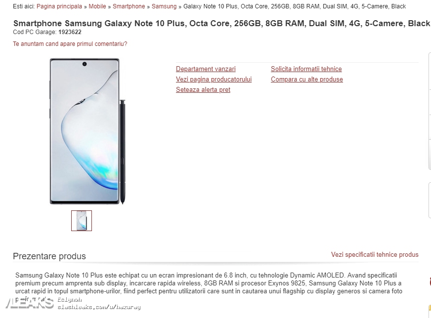 Za kilka dni pojawią się oficjalnie, ale do tego czasu będziemy mieć pewnie dziesiątki przecieków i zdjęć dotyczących lub prezentujących smartfony z serii Galaxy Note 10. Tym razem padło na model z plusem, którego specyfikacja pojawiła się w zagranicznym sklepie.