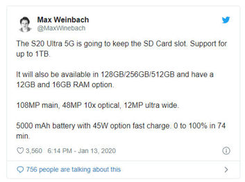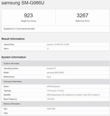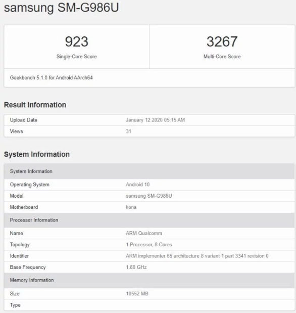 Smartfon pojawił się ostatnio w Geekbench jako SM-G986U. Może pochwalić się Androidem 10 (prawdopodobnie z nakładką One UI 2.0), 12 GB pamięci RAM i Snapdragonem 865 (w zależności od rynku może być też Exynos 990). Wyposażono go w taki sam zestaw aparatów jak w modelu 4G.