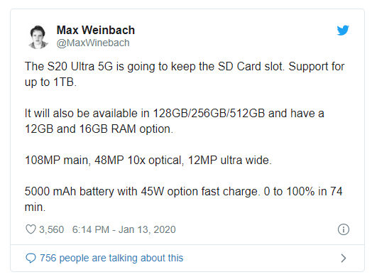 To model, w którym najwięcej się dzieje w aspekcie fotograficznym. Główny aparat ma 108MP, do tego teleobiektyw 48MP (optyczny zoom 10x), aparat z szerokim kątem o rozdzielczości 12MP i moduł ToF. Ponadto oferuje imponujący, 100-krotny zoom hybrydowy. Model ten ma 6,9-calowy ekran Dynamic AMOLED o odświeżaniu 120 Hz. Wersja 5G modelu S20 Ultra będzie miała 12 lub 16 GB pamięci RAM, oraz trzy wersje pamięci: 128 GB, 256 GB i 512 GB. Model ten będzie miał także gniazdo na karty microSD, obsługujące nośniki do 1 TB. Smartfon ma mieć baterię o pojemności 5000 mAh, która dzięki szybkiemu ładowaniu 45 W naładuje się do 100% w 74 minuty.