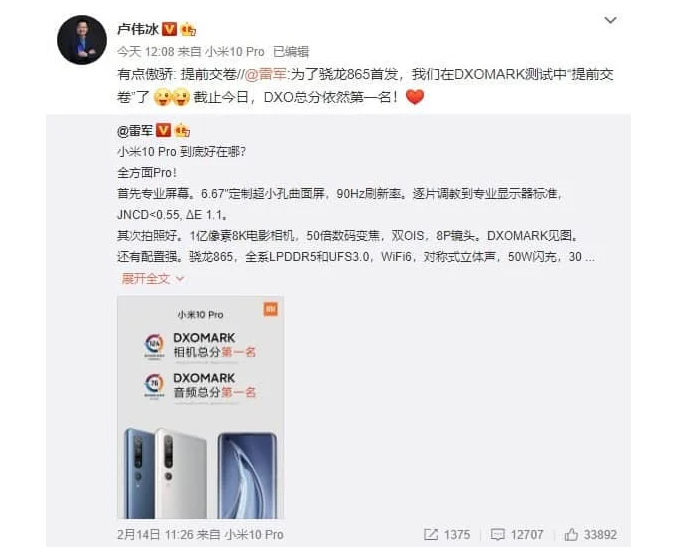 Szybko pojawiła się reakcja CEO Xiaomi na wynik smartfonu Oppo. Lei Jun zasugerował, za pośrednictwem Weibo, że aparaty w Xiaomi Mi 10 Pro mogą być jeszcze lepiej zoptymalizowane. Po kilku drobnych poprawkach aparat może radzić sobie lepiej i odzyskać niepodzielne pierwsze miejsce w rankingu. Okazało się też, że do DxOMark wysłane przekazane zostały modele, które lepiej sprawdzały się w fotografii od smartfonów, które trafiły na rynek. Testowe egzemplarze miały lepszy autofocus i lepiej radziły sobie w słabym świetle, lepiej ustawiały tryb HDR i nie dostarczały fioletowego odcienia na zdjęciach nocnych. Firma przygotowała już aktualizację, która ma zapewnić taką samą jakość zdjęć w komercyjnych egzemplarzach jak w tych testowanych przez DxOMark.