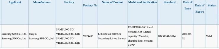 Zauważono też dane dotyczące pojemności dwóch baterii - pierwsza o oznaczeniu EB-BF707ABY o pojemności 2500 mAh, a druga o nazwie EB-BF708ABY o pojemności 704 mAh. Prawdopodobnie należą one do modelu Galaxy Z Flip 5G, który będzie miał dwa ogniwa o łącznej pojemności 3204 mAh - tak samo było w przypadku oryginalnego Flipa.