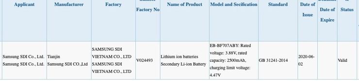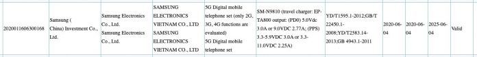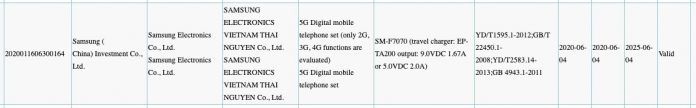 Według certyfikatu Samsung SM-F7070 zostanie wyposażony w ładowarkę 15 W, natomiast SM-N9810 w ładowarkę 25 W.