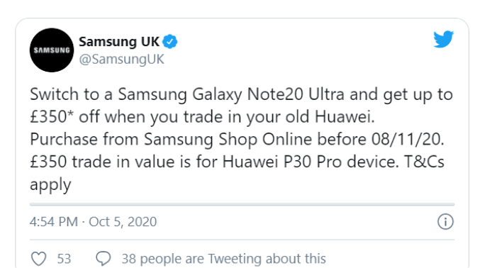 Samsung podjął też bardziej bezpośrednie działania, zachęcając na Twitterze obecnych klientów Huawei (akurat chodzi o rynek brytyjski) do przesiadki na swoje urządzenia - konkretnie na Samsunga Galaxy Note 20. Oferuje tu rabat na oddanie dotychczasowego smartfonu Huawei, np. posiadacze Huawei P30 Pro mogą zyskać nawet 350 funtów, a właściciele P30 - do 200 funtów.