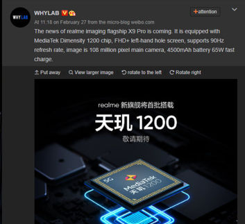 Według ujawnionych informacji Realme X9 Pro będzie wyposażony w wyświetlacz o rozdzielczości Full HD+ i częstotliwości odświeżania 90 Hz. Zasilać będzie go układ Dimensity 1200, a energii dostarczy bateria o pojemności 4500 mAh, która obsługuje szybkie ładowanie 65 W. Za zdjęcia odpowiadać będzie główny aparat o rozdzielczości 108 megapikseli. Wcześniej ujawnione informacje wskazywały, że X9 Pro będzie miał 6,4-calowy ekran o rozdzielczości FHD+, potrójny aparat (główny aparat 108 MP + 13 MP szeroki kąt + 13 MP teleobiektyw). Może mieć do 12 GB pamięci RAM i 128 lub 256 GB pamięci wewnętrznej. Prawdopodobnie będzie pracował z systemem Android 11 opartym na Realme UI 2.0.