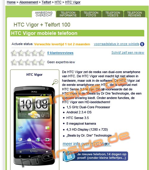 Niech nie zmyli was zrzut ekranu, HTC Vigor nie jest jeszcze ogólnie dostępny, a jego pojawienie się w ofercie holenderskiego sklepu internetowego było jedynie - prawdopodobnie - szybko zauważoną pomyłką, toteż nie można go już tam znaleźć. Na premierę telefonu poczekamy jeszcze co najmniej do Świąt - a jest na co czekać!