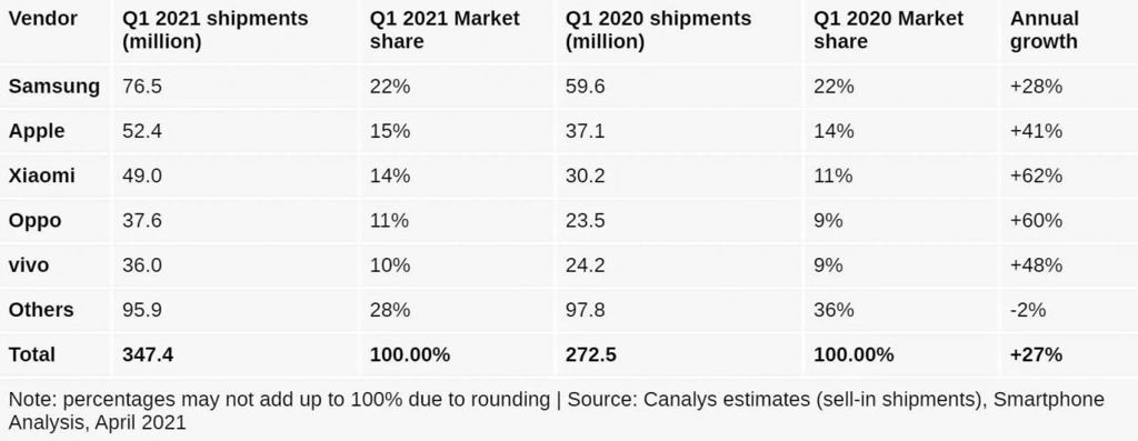 Producent iPhone'a zajął drugie miejsce, sprzedając 56,4 mln smartfonów w pierwszym kwartale 2021 roku i zdobył 16-procentowy udział w rynku. Chińska marka Xiaomi zajęła trzecie miejsce, sprzedając 49,5 miliona telefonów i mając 14-procentowy udział w rynku. Vivo i OPPO również zyskały na popularności. Firma Vivo sprzedała 38,2 miliona telefonów (11 procent udziału w rynku), podczas gdy OPPO zajęło piąte miejsce po sprzedaniu 37,8 miliona sztuk i osiągnięciu 11-procentowego udziału w rynku. Huawei, niegdyś jeden z największych producentów, uzyskał zaledwie 4 proc. udziału w rynku po sprzedaniu 14 milionów telefonów.