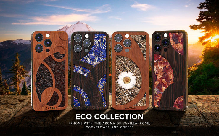 Nowe, ekskluzywne projekty iPhone'a 13 Pro wykonane są wyłącznie z ekologicznych, naturalnych i w pełni biodegradowalnych materiałów. Korpus każdego smartfona z serii Eco będzie wykonany z czerwonego mahoniu, pozyskiwanego w zrównoważony sposób. Nowe wzory zostaną ozdobione naturalnymi materiałami (bez użycia biocydów, plastyfikatorów i rozpuszczalników), każdy z własnym zapachem: aromatem zmielonej kawy, pączków róży, kwiatów alpejskich czy rumianku.