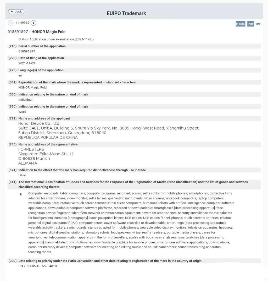 Honor złożył dwa wnioski w EUIPO (europejskim urzędzie danych dotyczących własności intelektualnej) o zastrzeżenie nowych znaków towarowych: Honor Magic Fold (Magic Fold) i Honor Magic Wing (Magic Wing). Oba zostały sklasyfikowane w kategorii urządzeń elektronicznych. Nie wiadomo, jakie konkretnie będą to urządzenia, niemniej nazwa Magic Fold sugeruje, że może to być smartfon ze składanym ekranem lub laptop. Wing z kolei może być smartfonem ze składanym lub rolowanym ekranem.