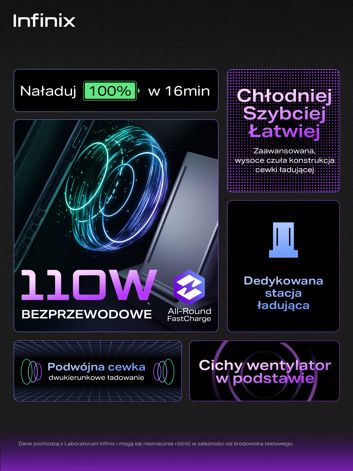 Rozwiązanie zwane All-Round FastCharge pozwoli naładować smartfona do pełna w niecałe 8 minut za pośrednictwem kabla, lub indukcyjnie w 16 minut. Osiągnięto to stosując specjalną konstrukcję akumulatorów (o pojemności 4400 mAh), a także zastosowaniu czterech "pomp" przekazujących energię do baterii z wysoką efektywnością. Niezbędny jest też specjalny zasilacz. Ładowarka wykorzystuje nową architekturę obwodów PFC+AHB z potrójnego materiału GaN, a równocześnie jest niewielka, biorąc pod uwagę jej możliwości, i zapewnia bezpieczeństwo oraz inteligentną kontrolę ładowania. Ładowarki można używać do ładowania innych urządzeń. Specjalnie zaprojektowany kabel jest wyposażony w kontrolujący przepływ energii chip E-marker i może przewodzić prąd o natężeniu do 13 A. W układzie ładowania indukcyjnego zastosowano z kolei nowo opracowane cewki o większej powierzchni. Bezpieczeństwo urządzeń zapewnia ponad 140 mechanizmów ochronnych i ponad 20 czujników temperatury, które chronią przed przegrzaniem nawet podczas ładowania w wysokich temperaturach. Infinix zapewnia, że akumulator zachowuje ponad 90% energii nawet po tysiącu cykli ładowania.