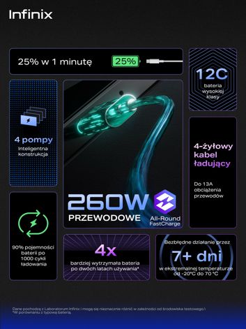 Realme pokazało, że smartfon da się naładować w mniej niż 10 minut. Infinix idzie o krok dalej. Smartfon ładujący się w kwadrans z mocą 180 W mamy już w naszych sklepach, a już niebawem uznamy to za przeżytek - pojawi się bowiem możliwość ładowania z mocą 260 W. To oczywiście przewodowo, bo bezprzewodowo Infinix zaproponuje 110 W. To moc, jakiej nie powstydziłoby się wiele flagowców przy ładowaniu tradycyjnym... Nowe technologie zadebiutują jeszcze w tym roku w nowych smartfonach Infinix z serii NOTE.