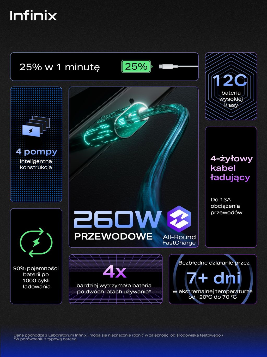 Rozwiązanie zwane All-Round FastCharge pozwoli naładować smartfona do pełna w niecałe 8 minut za pośrednictwem kabla, lub indukcyjnie w 16 minut. Osiągnięto to stosując specjalną konstrukcję akumulatorów (o pojemności 4400 mAh), a także zastosowaniu czterech "pomp" przekazujących energię do baterii z wysoką efektywnością. Niezbędny jest też specjalny zasilacz. Ładowarka wykorzystuje nową architekturę obwodów PFC+AHB z potrójnego materiału GaN, a równocześnie jest niewielka, biorąc pod uwagę jej możliwości, i zapewnia bezpieczeństwo oraz inteligentną kontrolę ładowania. Ładowarki można używać do ładowania innych urządzeń. Specjalnie zaprojektowany kabel jest wyposażony w kontrolujący przepływ energii chip E-marker i może przewodzić prąd o natężeniu do 13 A. W układzie ładowania indukcyjnego zastosowano z kolei nowo opracowane cewki o większej powierzchni. Bezpieczeństwo urządzeń zapewnia ponad 140 mechanizmów ochronnych i ponad 20 czujników temperatury, które chronią przed przegrzaniem nawet podczas ładowania w wysokich temperaturach. Infinix zapewnia, że akumulator zachowuje ponad 90% energii nawet po tysiącu cykli ładowania.