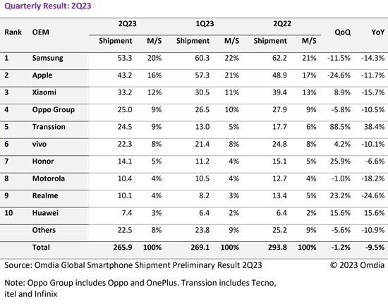 Raport Omdia przedstawia udziały rynkowe producentów na podstawie dostaw. Nie oddaje on zatem idealnie liczby smartfonów już zakupionych przez konsumentów - niemniej zwykle wolumen dostaw stanowi odzwierciedlenie potrzeb rynku - czyli sprzedaży. Omdia porównuje drugi kwartał bieżącego roku z analogicznym okresem poprzedniego, dodając jeszcze dla porównania wyniki z I kwartału br. Która firma radzi sobie najlepiej, a która notuje największe spadki udziałów?