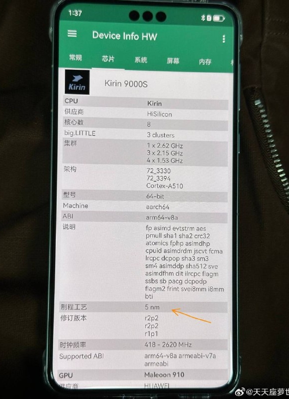 Dzięki publikacji leakstera Everythingleaks wiemy jednak, że Huawei Mate 60 Pro ma procesor Huawei Kirin 9000s, powstający w litografii 5 nm (według innych źródeł - 7 nm, 12-rdzeniowy). Układ ten jest oparty o główny, najwydajniejszy rdzeń Taishan V120 z zegarem 2,62 GHz, trzy rdzenie V120 2,15 GHz i cztery energooszczędne Cortex A510 o taktowaniu 1,53 GHz. Komplet dopełnia grafika Mali G78 i - co najciekawsze - modem 5G.