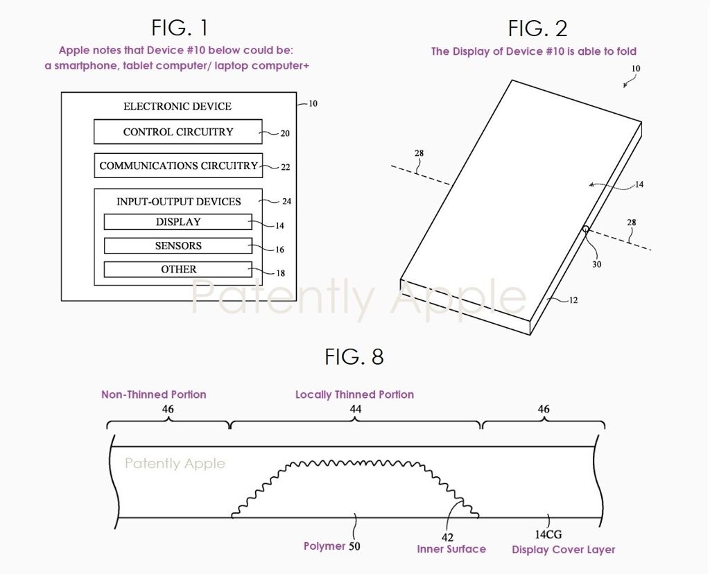 A skoro jesteśmy w temacie składaków, Apple także pracuje nad takim urządzeniem. Za prototypowe wyświetlacze odpowiadają technologie z Samsung Display, jak i LG Display. Apple opatentowało rozwiązanie, które zmniejsza zagięcie tam, gdzie wyświetlacz składa się na pół. Wytrawienie rowka w ultracienkim szkle i pokrycie go elastycznymi polimerami ułatwia zginanie panelu wyświetlacza, dzięki czemu zagięcie jest mniej widoczne. Nikt nie zbudował jeszcze takiego ekranu.