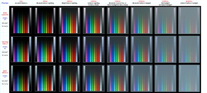 Czytelność ekranu zależy nie tylko od jego jasności i zastosowanej technologii, ale także od bardziej prozaicznych czynników - jak choćby rodzaj szkła zakrywającego matrycę. Naukowcy z DisplayMate pod wodzą swego szefa Dr. Raymonda M. Soneiry opublikowali na swej stronie tabelę obrazującą odwzorowanie barw i jasność ekranów w wybranych urządzeniach przy świetle od 0 do 5 tysięcy luksów. Dla porównania warto dodać, że 0 luksów to kompletna ciemność, zaś światło dzienne daje jasność rzędu 5-20 tys. luksów. Tabele pomiarowe znajdziecie na stronie DisplayMate. Ja ograniczę się do zrelacjonowania wyników badań.
