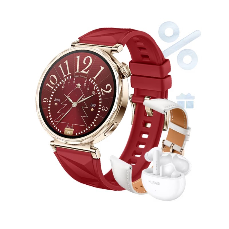 Nowe zegarki nie odbiegają parametrami od standardowych modeli Huawei Watch GT 5, za to wyróżnia je wygląd - odświętne tapety na wyświetlaczu i dopasowane kolorystycznie paski. Kiedy świąteczny nastrój już minie, pasek będzie można wymienić na alternatywny, dołączony do zestawu - model 41 mm można dostać z białym skórzanym albo złotym metalowym paskiem, a smartwatch w wersji 46 mm oferuje alternatywny pasek z brązowej skóry albo czarnego fluoroelastomeru.