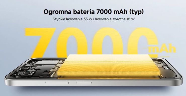 POCO M7 4G - lub dla ścisłości, po prostu POCO M7 - jest napędzany procesorem Qualcomm Snapdragon 685, zestawianym z pamięciami typu LPDDR4X i UFS 2.2 w pojemnościach 6+128 albo 8+256 GB. Jest oczywiście wirtualny RAM, ale i gniazdo na microSD do rozbudowy pamięci wewnętrznej. Smartfon ma pokaźny, 6,9-calowy ekran o rozdzielczości Full HD+ i odświeżaniu do 144 Hz, ale niestety w technologii LCD. Ekran próbkuje dotyk z częstotliwością 288 Hz i osiąga jasność 850 nitów. Zasilanie zapewnia pokaźny akumulator o pojemności 7000 mAh, ładujący się z mocą 33 W. Jest też ładowanie zwrotne 18 W. Bateria ma zapewnić do 46 godzin rozmowy, albo 28 godzin oglądania filmów, a w praktyce, 2,32 dni działania - według producenta.