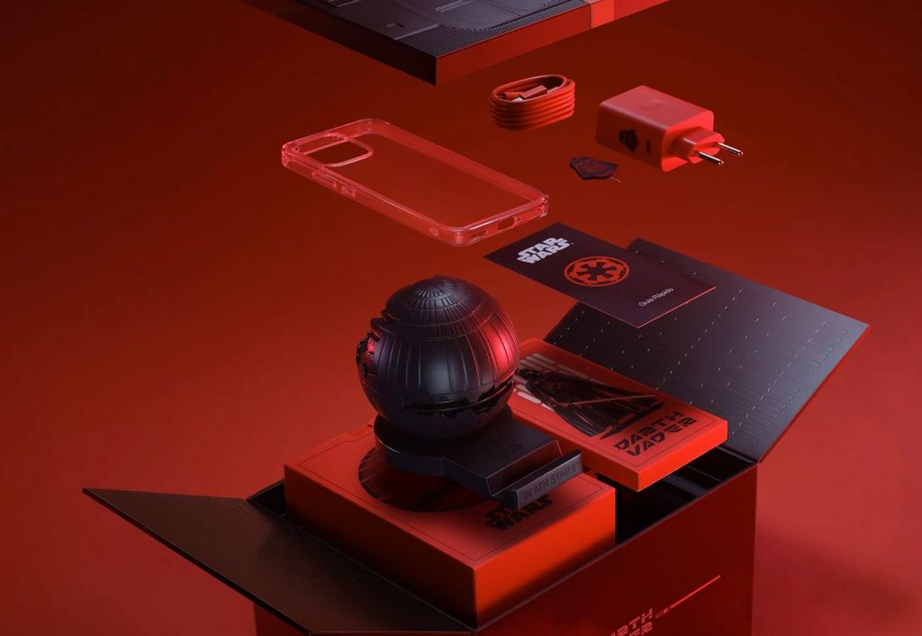 Oppo Reno 14F Dark Side Limited Edition jest dostarczany w ekskluzywnym opakowaniu, z wyobrażeniem Gwiazdy Śmierci w tle. Z kolei sam smartfon jest grafitowo szary i ma na tyle obudowy logo serii i hełm Lorda Vadera. Kształt hełmu ma też igła do otwierania gniazda kart, a w zestawie jest też podstawka pod smartfon w kształcie Gwiazdy Śmierci. Do tego mamy tematyczne, czerwone akcesoria - ładowarkę, przewód i pokrowiec. Ponadto, smartfon ma też tematyczne tapety i tematy ekranowe oraz dźwięki.