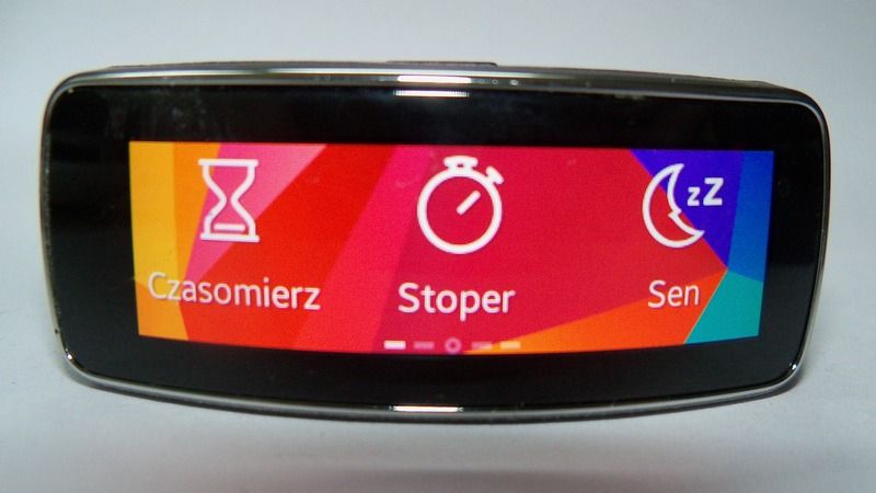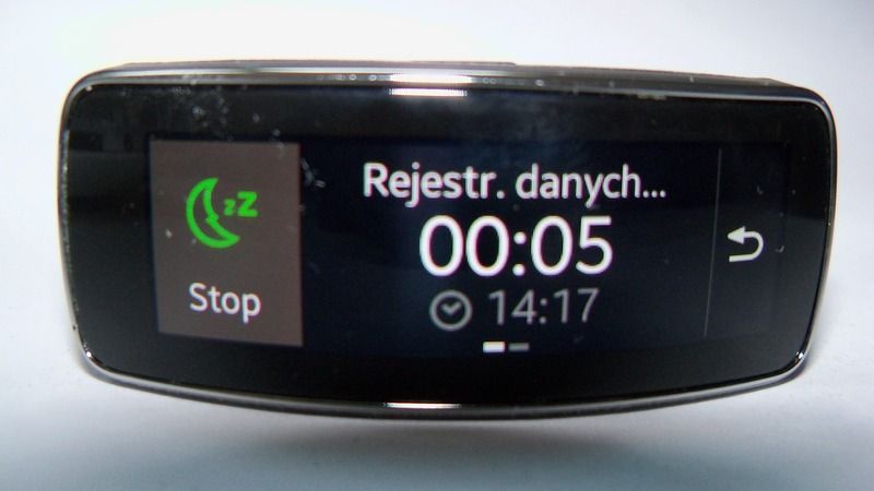- puls - Pulsometr bazuje na czujniku zlokalizowanym na spodniej części urządzenia. Kiedy chcemy uzyskać prawidłowy pomiar, nie można się ruszać ani mówić. Na dodatek zależy jeszcze, czy nosimy Gear Fit na wierzchu nadgarstka (79 uderzeń/min), czy też od jego wewnętrznej strony (87 uderzeń/min). Pulsometr można wykorzystywać jako samodzielną funkcję, ale ciekawsze jest jego zastosowanie w ramach określonych cykli ćwiczeń (jazda na rowerze, bieganie, chód i piesze wycieczki) - wtedy to pomiar następuje automatycznie co określony czas.