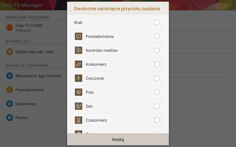 Niestety bez udziału smartfona lub tabletu Samsunga nie będziemy w stanie rozpocząć pracy z Gear Fit. Dlatego gadżet ten jest bardziej dodatkiem do któregoś sprzętu z rodziny Galaxy niż samodzielnym urządzeniem. Aby połączyć i zsynchronizować urządzenia, należy wpierw ściągnąć i zainstalować aplikację Gear Fit Manager z Samsung Apps (próżno jej szukać w Google Play). Pierwszym krokiem po włączeniu gadżetu jest jego sparowanie z drugim urządzeniem. Do komunikacji między urządzeniami służy moduł Bluetooth. Poniżej znaleźć można kilka zrzutów ekranu z aplikacji Gear Fit Manager (na tablet Samsung Galaxy TabPro 10.1).