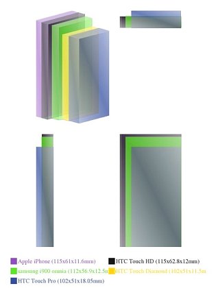 W sklepach ma się znaleźć podobno na Święta. Mniejszy, choć grubszy niż iPhone, minimalnie większy od Diamonda ma wymiary 115mm x 62,8mm x 12mm - niżej na obrazku można go porównać z konkurentami. Będzie i obsługa HSDPA i GPS, a do tego kamera 5 Mpx. Piszą, że bez lampy błyskowej, ale zdaje się że to blaga. Jak można wypuścić 5 Mpx bez flasha? Ze zdjęć widać, że pamięć użytkownika to ok. 330MB, a dane będzie można przesyłać przez extUSB i Bluetooth w wersji 2.0 z EDR. Do tego należy dołożyć obsługę kart pamięci microSD z SDHC i bateryjkę o pojemności - bagatela - 1350 mAh. Ciekawe ile czasu wytrzyma przy takim ekranie. Autorzy informacji twierdzą, że HTC Touch HD będzie miał gniazdo jack - i znów nie chce mi się wierzyć, że HTC zrezygnowało z forsowania własnego gniazda i pokłoniło się w stronę oczekiwań klientów, ale kto wie?