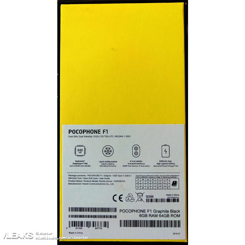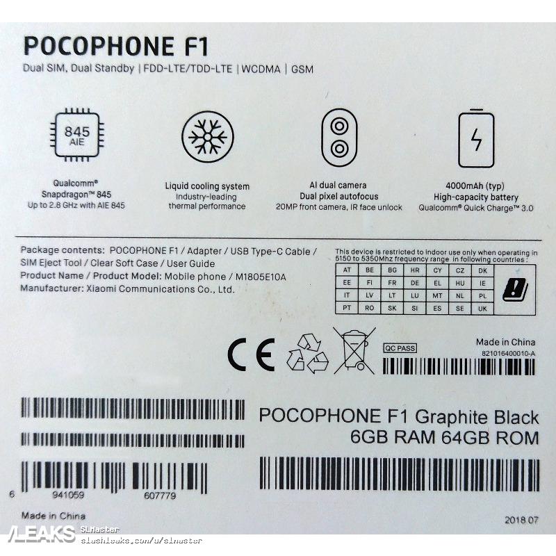 Ja już wiemy z wcześniejszych przecieków, Pocophone F1 to urządzenie z 6,18-calowym ekranem FullHD+, Snapdragonem 845 z grafiką Adreno 630, 6 GB pamięci RAM, 64/128 GB pamięci wewnętrznej, do tego podwójnym aparatem głównym (12 + 5 MP) z autofocusem Dual Pixel, o jasności f/1.75, 20-megapikselowym aparatem do selfików z przysłoną f/2.0, baterią o pojemności 4000 mAh obsługującą szybkie ładowanie Quick Charge 3.0 oraz obsługą dwóch kart SIM. Wymiary urządzenia to 157,24x75,4x8,8 mm. Smartfon ma pracować w sieciach 2G/3G/4G, ma dwuzakresowy moduł Wi-Fia/b/g/n/ac. Bluetooth 5.0 i nawigację wykorzystującą systemy GPS, GLONASS i BeiDou.