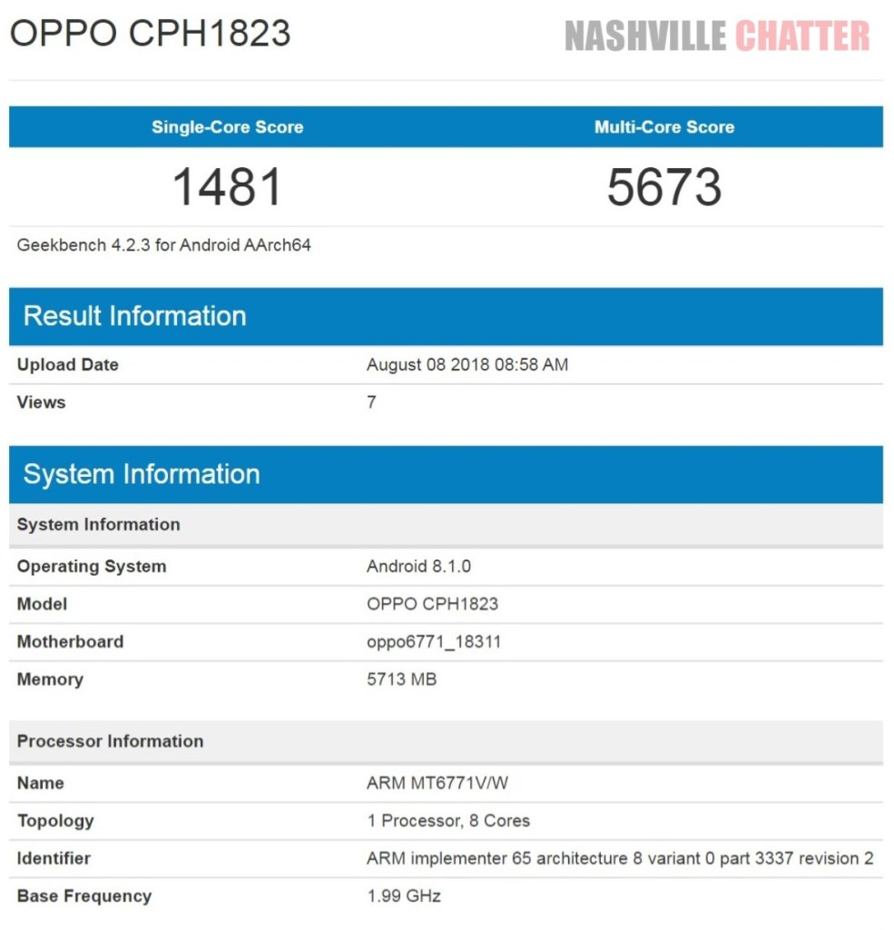 A teraz przejdźmy do technikaliów. Oppo F9 będzie miał wymiary 156,7x74 x7,99 mm i wagę 169 gramów. Ma być wyposażony w procesor MediaTek P60, 4 lub 6 pamięci RAM i 64 GB pamięci wewnętrznej. 6,3-calowy ekran ma mieć rozdzielczość 2280x1080 pikseli. Główny aparat jest podwójny (16MP + 2MP) z obiektywem o jasności f/1,85, zaś przedni aparat wykorzystuje 25-megapikselowy obiektyw o jasności f/2.0. Akumulator o pojemności 3500 mAh obsługuje ładowanie flash VOOC. Teraz model Oppo F9/F9 Pro, jako CPH1823, pojawił się w benchmarku Geekbench: