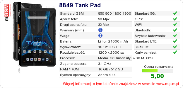 Masz swoją stronę? Chcesz wstawić gdzieś informacje o podstawowych danych telefonu 8849 Tank Pad ? To bardzo proste. Możesz pobrać obrazek, lub skopiować i wkleić na stronę poniższy kod:Wklejenie tego kodu spowoduje wyświetlenie poniższego obrazka: