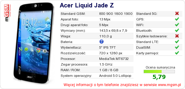 Dane telefonu Acer Liquid Jade Z na Twojej stronie