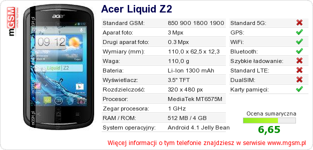 Dane telefonu Acer Liquid Z2 na Twojej stronie