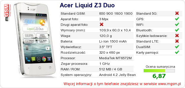 Dane telefonu Acer Liquid Z3 Duo na Twojej stronie