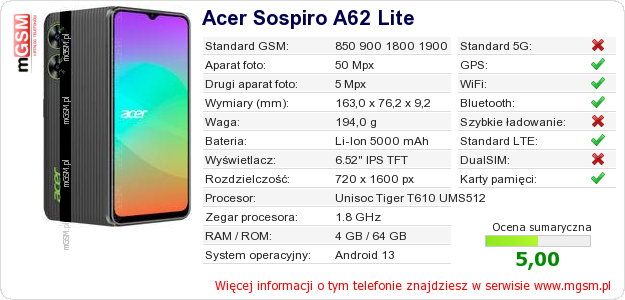 Dane telefonu Acer Sospiro A62 Lite na Twojej stronie