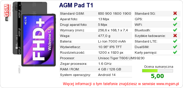 Dane telefonu AGM Pad T1 na Twojej stronie
