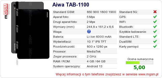 Dane telefonu Aiwa TAB-1100 na Twojej stronie