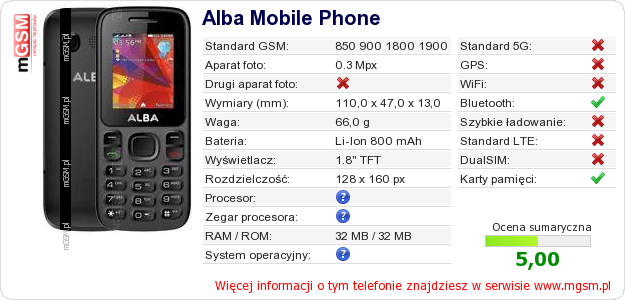Dane telefonu Alba Mobile Phone na Twojej stronie