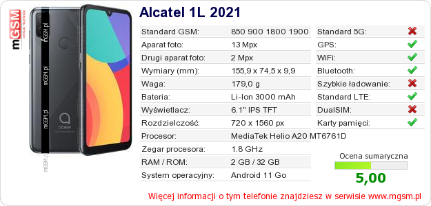 Dane telefonu Alcatel 1L 2021 na Twojej stronie