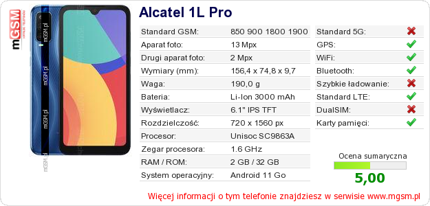 Dane telefonu Alcatel 1L Pro na Twojej stronie