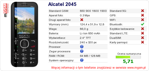 Dane telefonu Alcatel 2045 na Twojej stronie