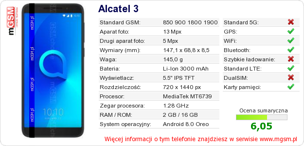 Dane telefonu Alcatel 3 na Twojej stronie