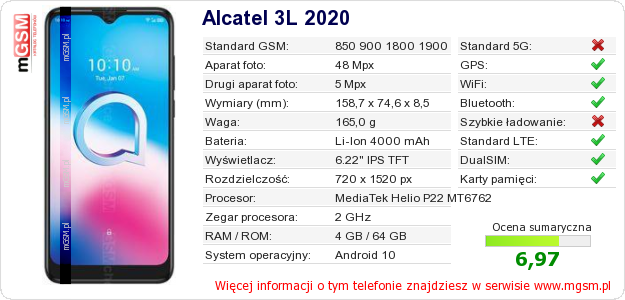 Dane telefonu Alcatel 3L 2020 na Twojej stronie