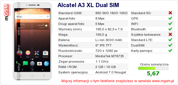 Dane telefonu Alcatel A3 XL Dual SIM na Twojej stronie