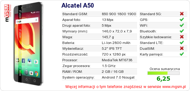 Dane telefonu Alcatel A50 na Twojej stronie