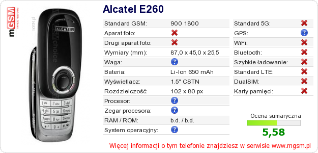 Dane telefonu Alcatel E260 na Twojej stronie