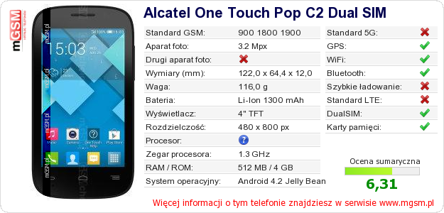 Dane telefonu Alcatel One Touch Pop C2 Dual SIM na Twojej stronie