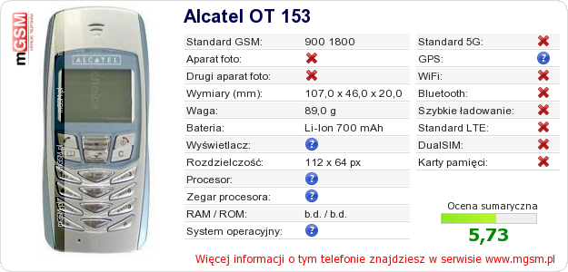 Dane telefonu Alcatel OT 153 na Twojej stronie