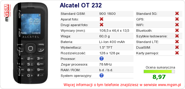 Dane telefonu Alcatel OT 232 na Twojej stronie