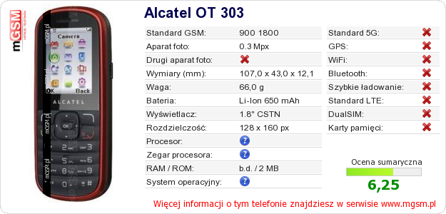 Dane telefonu Alcatel OT 303 na Twojej stronie