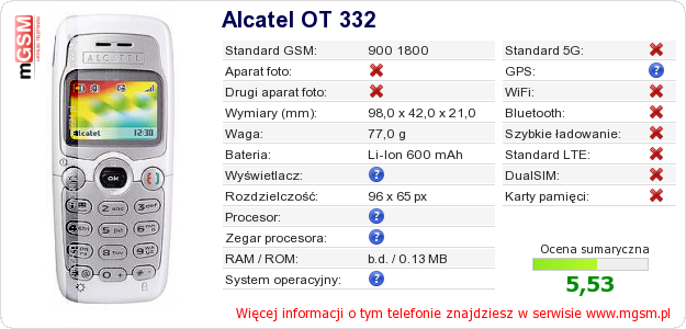 Dane telefonu Alcatel OT 332 na Twojej stronie