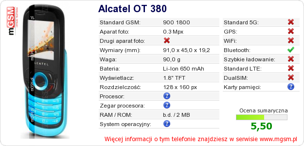 Dane telefonu Alcatel OT 380 na Twojej stronie